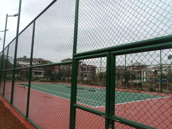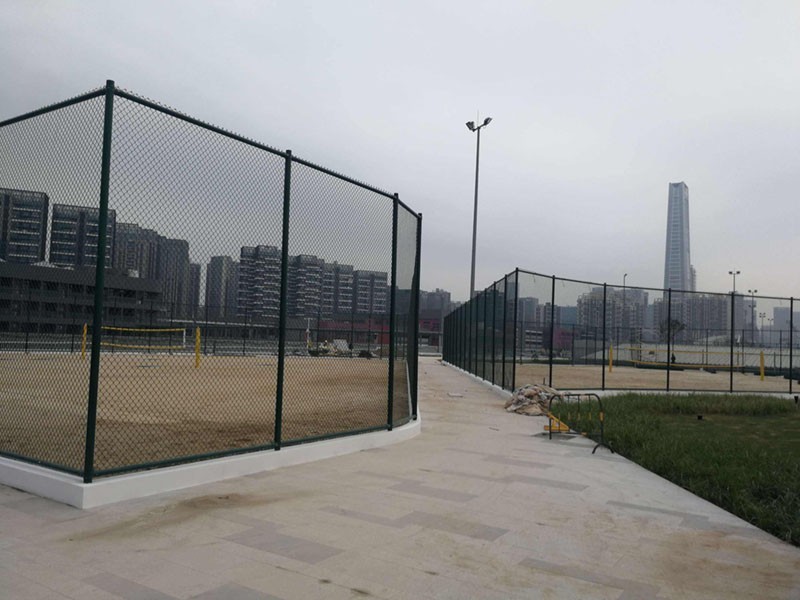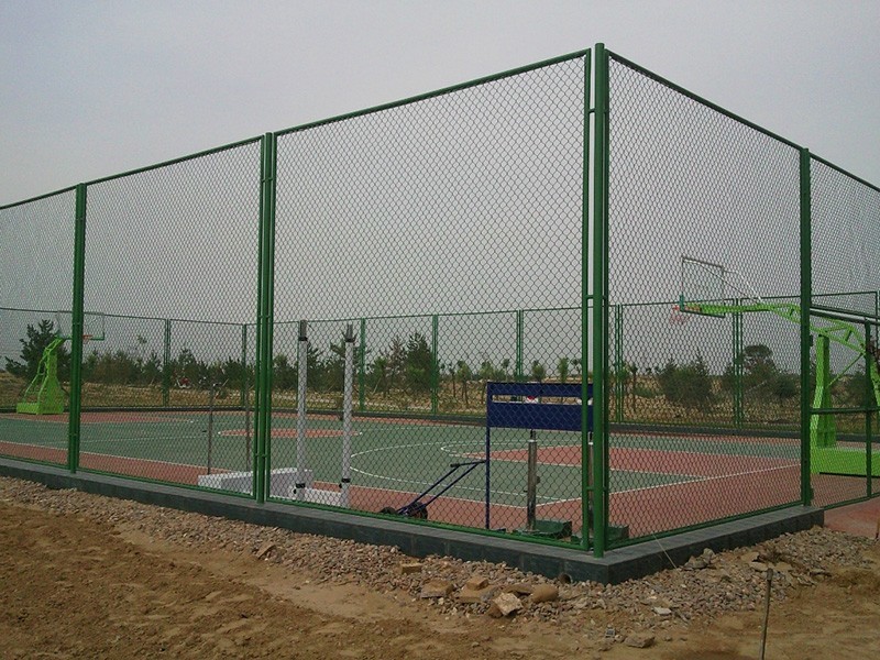 體育場圍欄網(wǎng)材質(zhì):包塑勾花網(wǎng),絲經(jīng)為3mm—5mm,網(wǎng)孔為40mm*40mm—70mm*70mm